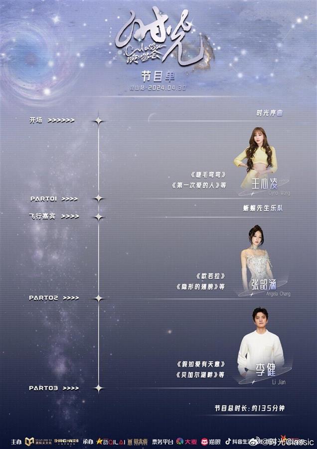 据“时光Classic”微博账号发布的昆山站演唱会节目单显示,在王心凌和张韶涵的演出环节之间,有一个名为“蜥蜴先生乐队”的“飞行嘉宾”,在节目单上字体较小。节目总时长约135分钟。主办方为源知义文化、上海赏缘文化。