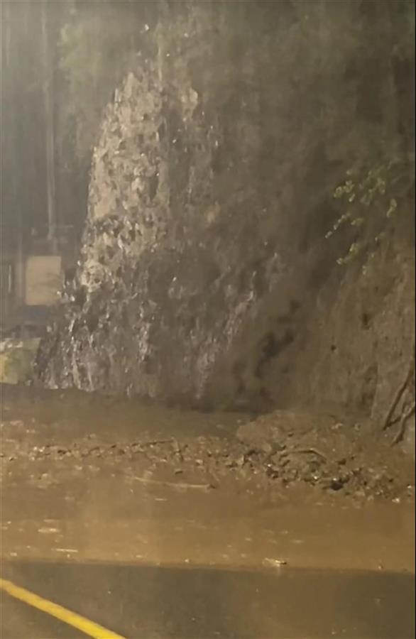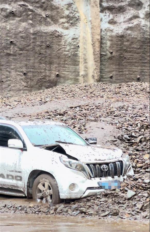 相关视频显示,大量泥石流从公路边的山上流到公路路面上,一辆小型机动车车身部分被埋在泥土中,附近路段车辆排起了长队。一家酒店的停车场内,多辆机动车部分车身被泥石流掩埋。