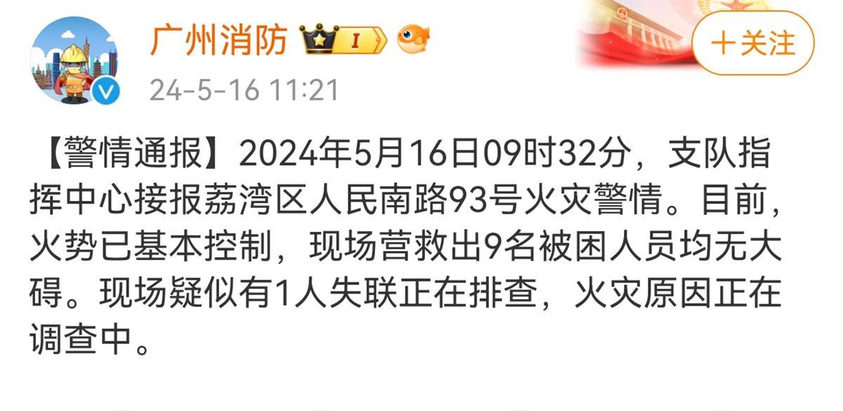 16日11时21分,广州消防官方微博发布警情通报称,5月16日09时32分,支队指挥中心接报荔湾区人民南路93号火灾警情。目前,火势已基本控制,现场营救出9名被困人员均无大碍。现场疑似有1人失联正在排查,火灾原因正在调查中。