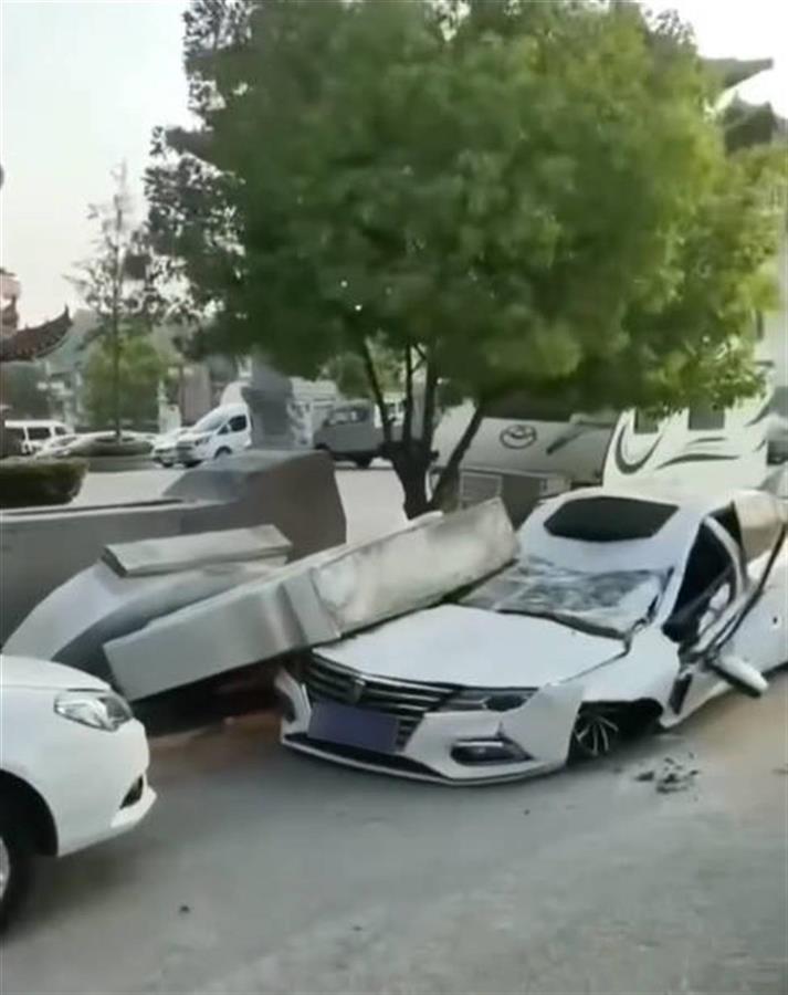 据中国消防微信公众号消息,镇平县有石雕被大风吹倒。事发地附近居民告诉极目新闻记者,被吹倒的石雕砸中了停在路边的一辆小轿车。