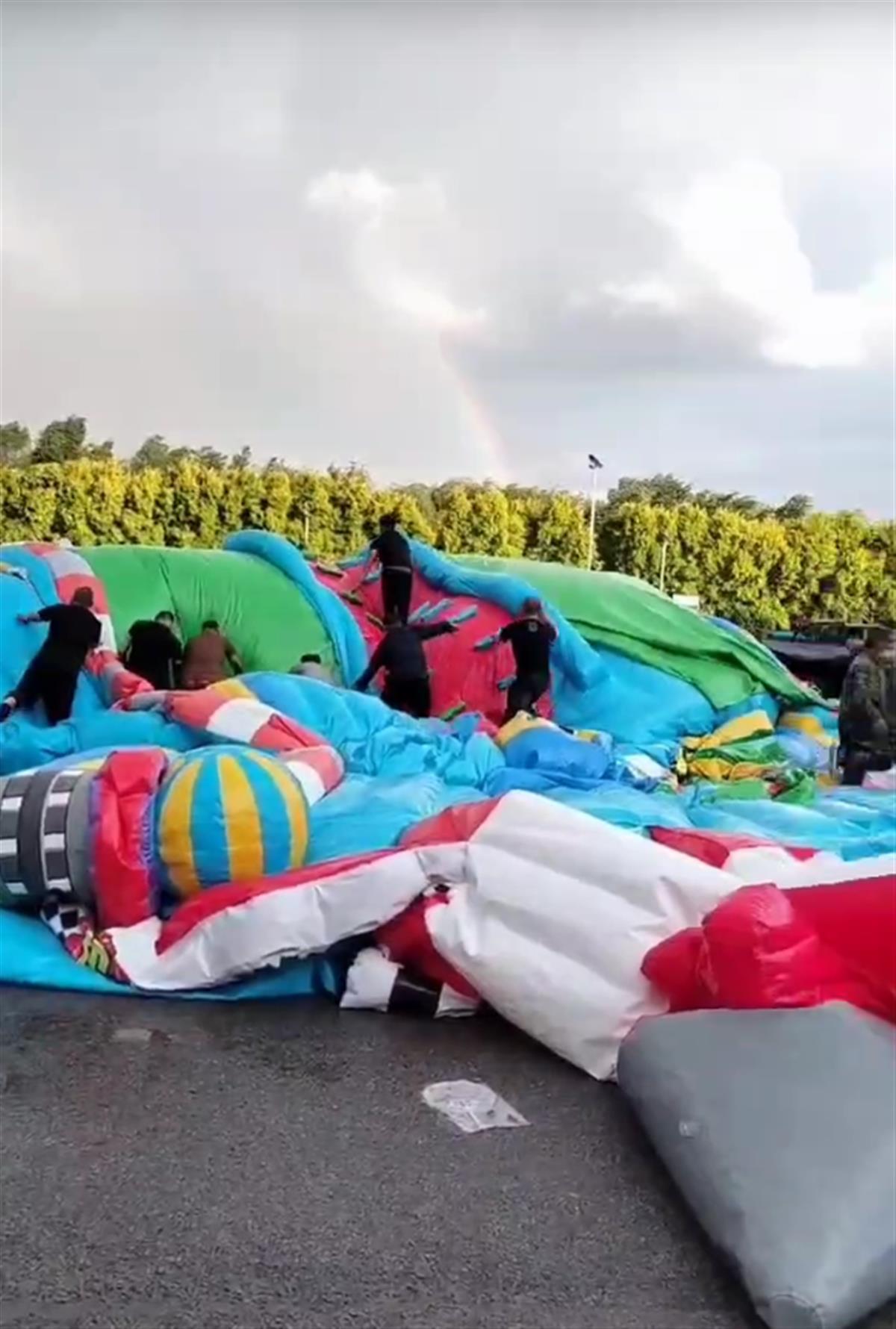 佟二堡派出所工作人员向极目新闻记者证实,6月1日,当地确有一个充气城堡被大风吹翻,是他们所同事出警处置的,具体情况需要向当地相关部门了解。