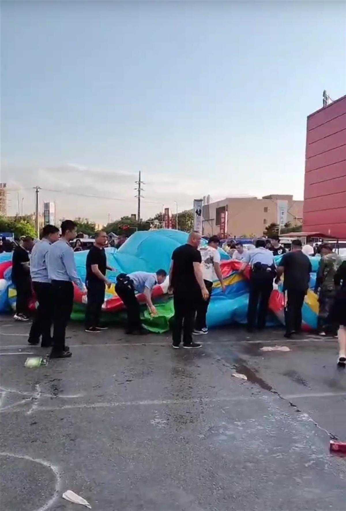 事发地点附近的一位餐饮商户介绍,6月1日晚,当地突然刮起大风,她连忙收拾好自家摊子。充气城堡距离她的摊子有数十米远,被大风吹翻,但她没时间靠近查看。