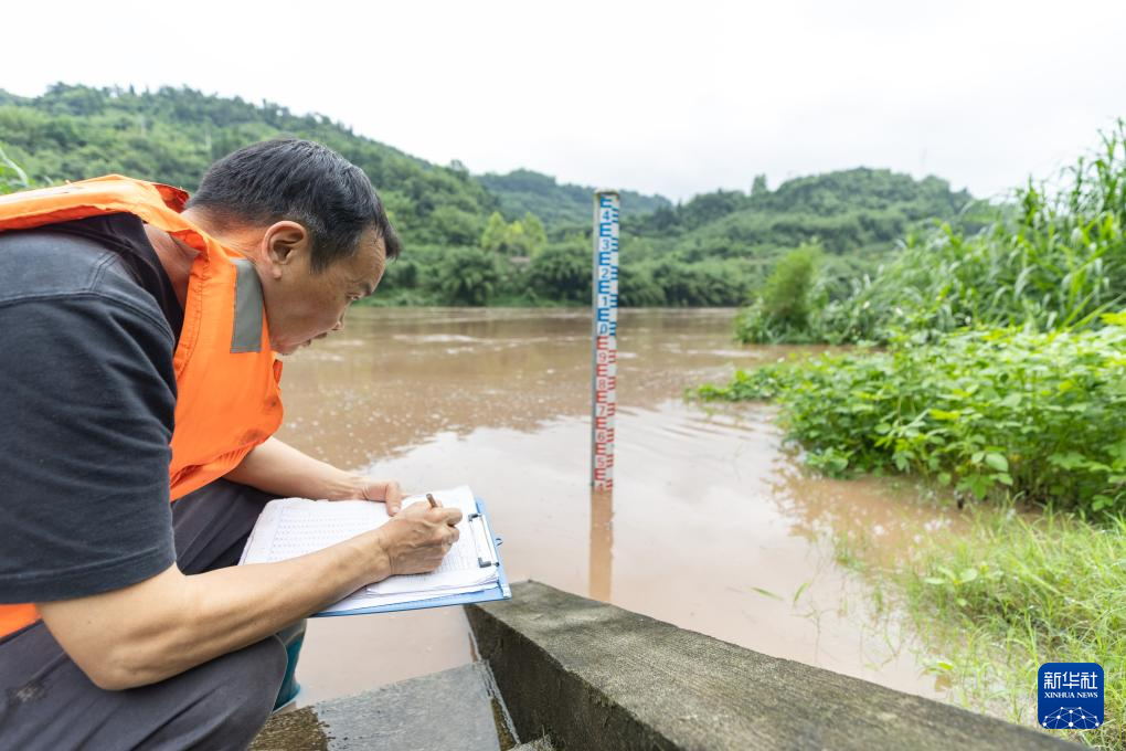 6月21日,在位于重庆市江津区的綦江五岔水文站,工作人员李红在观测记录洪水的实时水位。