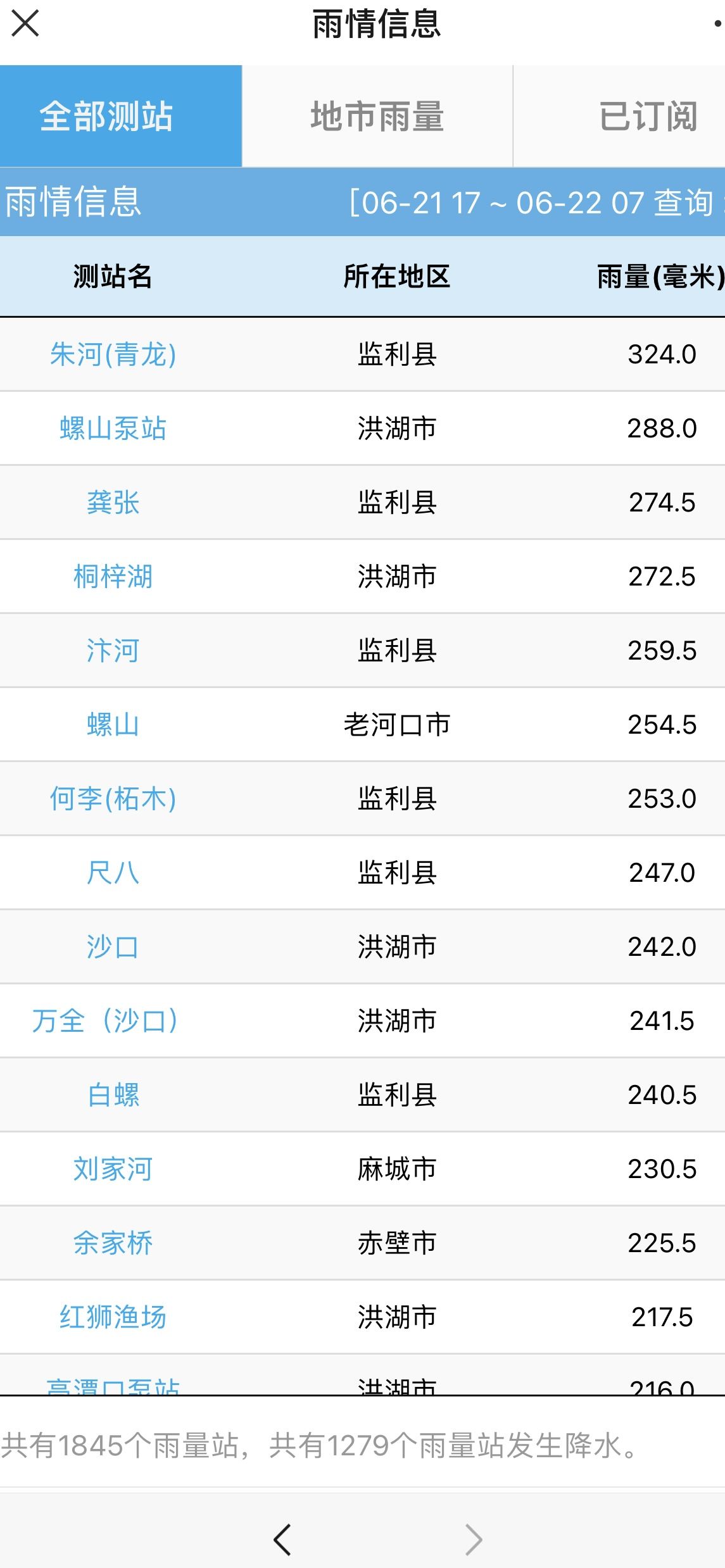 从21日下午到22日,湖北多地迎来强降雨,局地大暴雨。长江云新闻记者22日获悉,全省1594个雨量监测点中85%的站点监测到雨量数据,最大站点来自荆州监利,10小时累计雨量突破了300毫米,有5个县市区累计雨量已超200毫米。