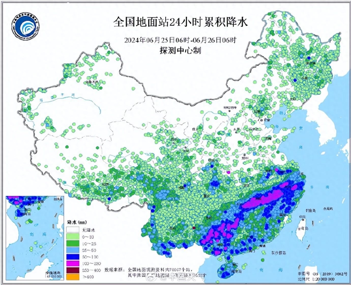 6月26日,据中国天气:中国气象局气象探测中心综合观测产品系统(天衡天衍)产品显示,25日06时-26日06时,江南、华南等地出现暴雨,局地出现大暴雨到特大暴雨,降水持续时间超过20小时。24小时最大累积降水量208.8毫米,发生在安徽黄山区焦村贤村卫生院;24小时最大1小时累积降水量75.2毫米,发生在广西防城港。