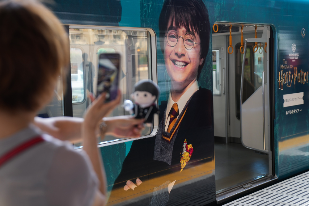 2023年6月16日,游客在日本东京丰岛园车站拍摄哈利波特主题电车。新华社记者张笑宇摄