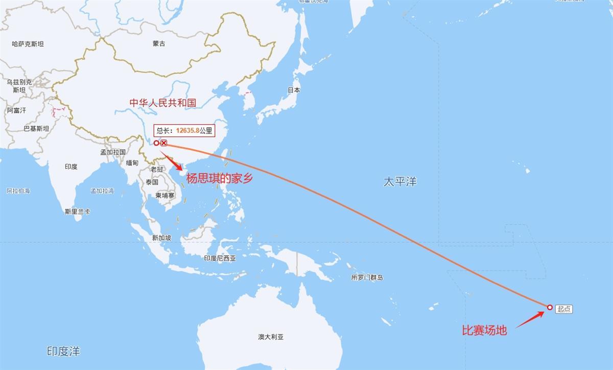 据了解,本届巴黎奥运会的冲浪比赛场地位于法属波利尼西亚的提阿胡普海滩,是世界知名冲浪胜地,位于太平洋。地图显示,杨思琪所在的大凉山距离该地直线距离1万多公里。