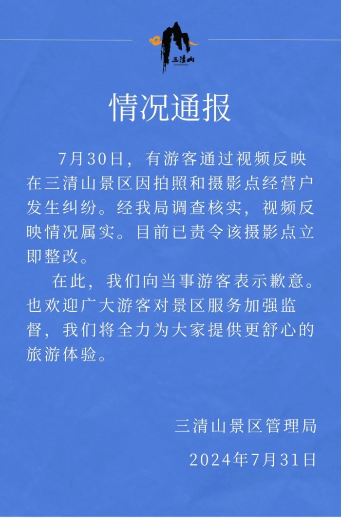近日,游客发视频称在三清山景区拍风景,不小心坐了一下商户的椅子被要求收费。7月31日,三清山景区管理局发布通报:经调查核实,视频反映情况属实。目前已责令该摄影点立即整改。在此,我们向当事游客表示歉意。