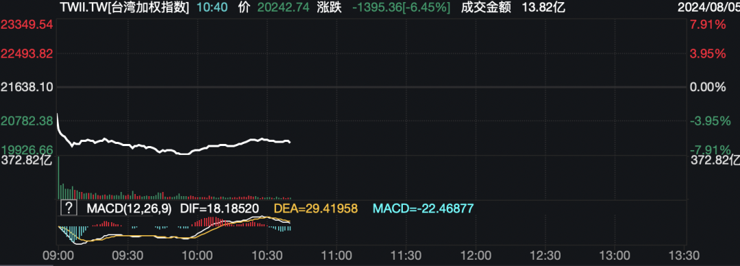 中国台湾地区股市上午也重挫,台湾加权指数上午盘中跌幅一度超过7%,为近年来盘中罕见的跌幅。