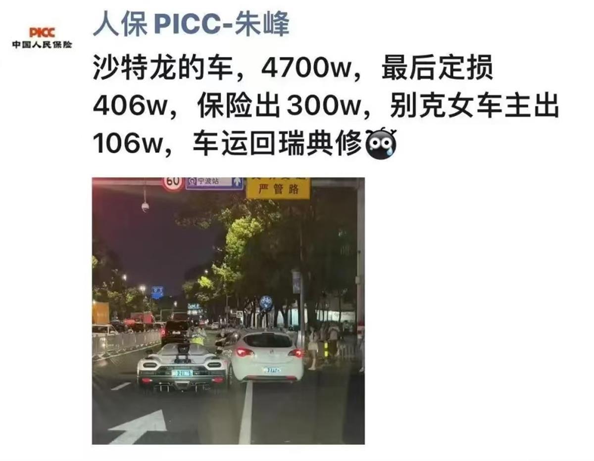 相关视频出现在网络后,有网友发文称,该跑车的主人是视频博主沙特龙,“车价4700万元,最后定损406万元,保险出300万,别克女车主出106万,车运回瑞典修。”