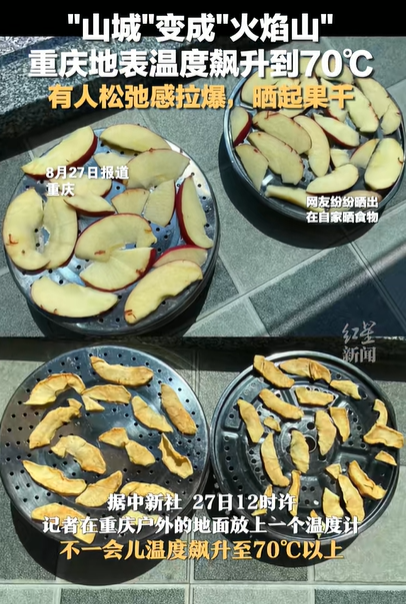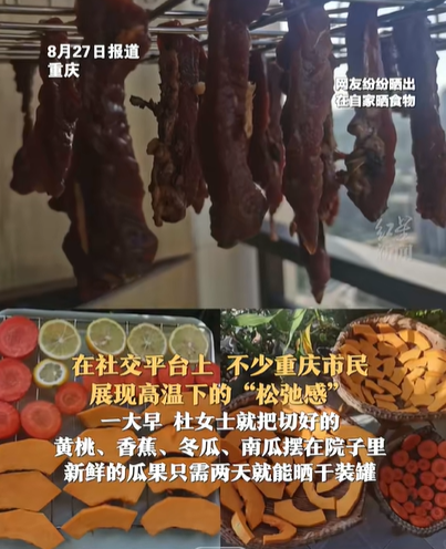 面对如此高温,不少重庆市民也将松弛感贯彻到底,在网上晒出自己在家晒食物的照片,并表示新鲜的瓜果只需两天就可以晒干装罐。