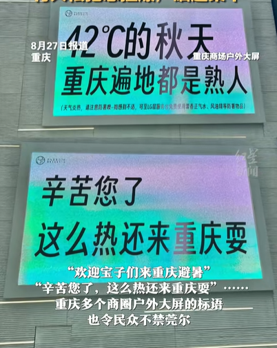 昨天27日12时许,记者在重庆户外的地面放上一个温度计,不一会儿温度飙升至70℃以上,重庆多个商圈户外大屏这几日也应景展示标语“辛苦您了,这么热还来重庆耍”“42℃的秋天,重庆遍地都是熟人”。