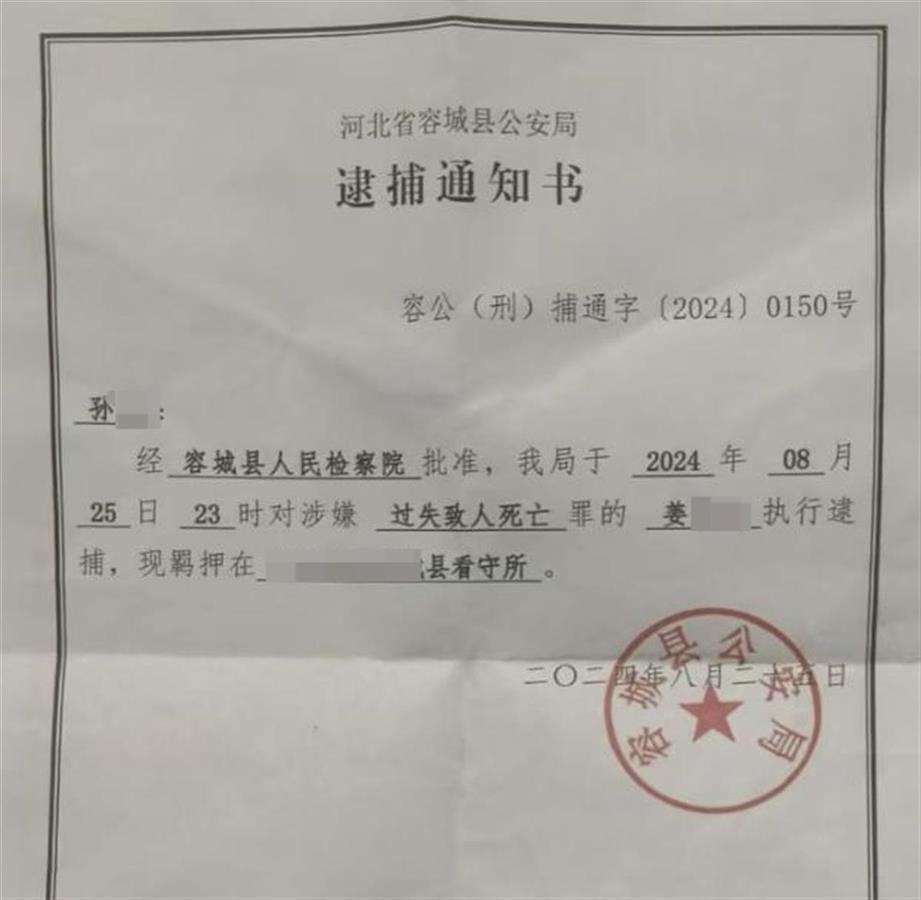 8月11日16时,容城县公安局以涉嫌过失致人死亡罪将司机姜某行政拘留,并羁押在看守所。姜某亲属提供的一份逮捕通知书显示,经容城县人民检察院批准,容城县公安局于8月25日23时对涉嫌过失致人死亡罪的姜某执行逮捕。
