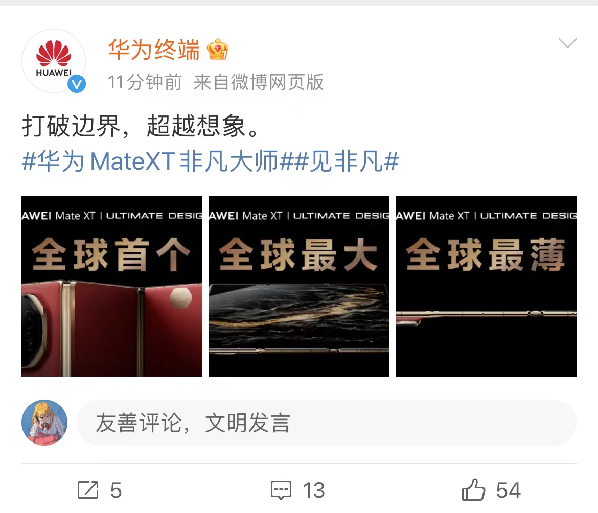 9月10日下午14:00,在苹果发布iPhone 16系列新品的13个小时后,华为全球第一款三折手机终于揭开面纱:正式推出全球首款三折叠屏手机Mate XT非凡大师,售价19999元起。