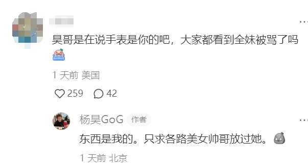 有网友在杨昊社交账号下求证,杨昊回应:东西是我的,只求各路美女帅哥放过她。
