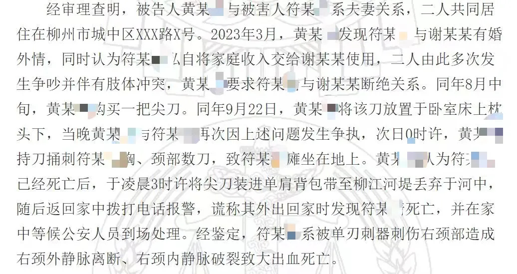 公开的判决书显示,经审理查明,被告人黄某某(60岁)与被害人符某某(殁年65岁)系夫妻关系,二人共同居住在柳州市城中区。2023年3月,黄某某发现符某某与谢某某有婚外情,同时认为符某某私自将家庭收入交给谢某某使用,二人由此多次发生争吵并伴有肢体冲突,黄某某要求符某某与谢某某断绝关系。