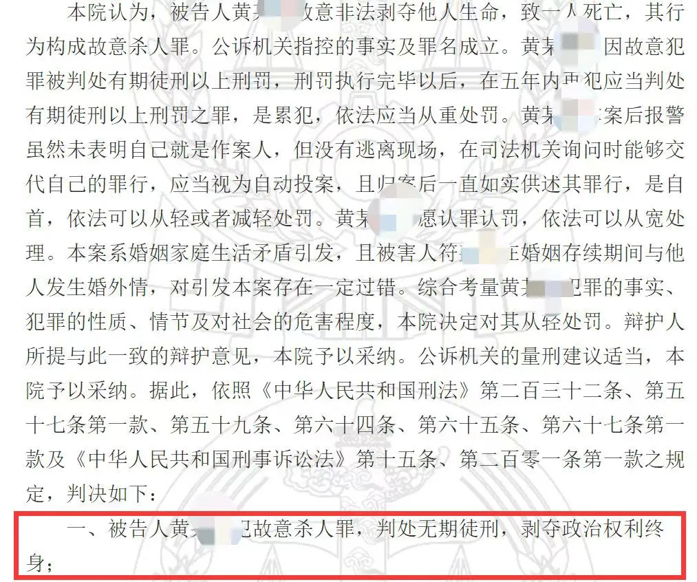 丈夫出轨被发现后,妻子黄某某要求其断绝往来,二人常为此争吵并伴有肢体冲突。黄某某购刀藏于枕头下,2023年9月22日,二人再为此事争执。次日0时许,黄某某持刀捅刺丈夫胸、颈部数刀,后丈夫死亡。近日,广西柳州市中级人民法院公开该案一审刑事判决书,被告人黄某某因犯故意杀人罪,被判处无期徒刑,剥夺政治权利终身。