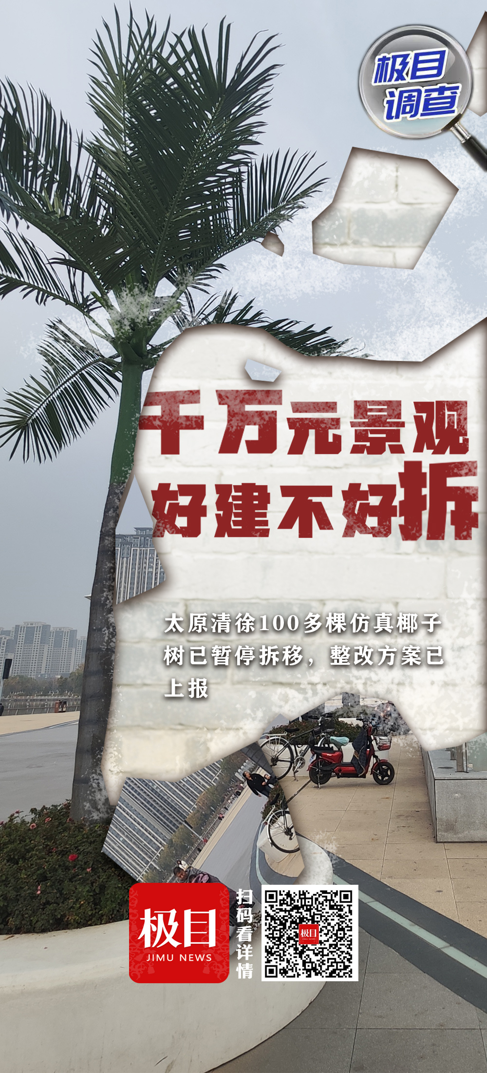 14日,极目新闻记者在清徐县走访了解到,有10棵仿真椰子树已拆除并移栽至附近的清源水城景区,广场上还剩100多棵仿真椰子树。清徐县官方表示,广场仿真椰子树拆除工作暂停,该县制定的整改方案已上报。另据当地官方人士透露,通报后省市纪检部门已介入。