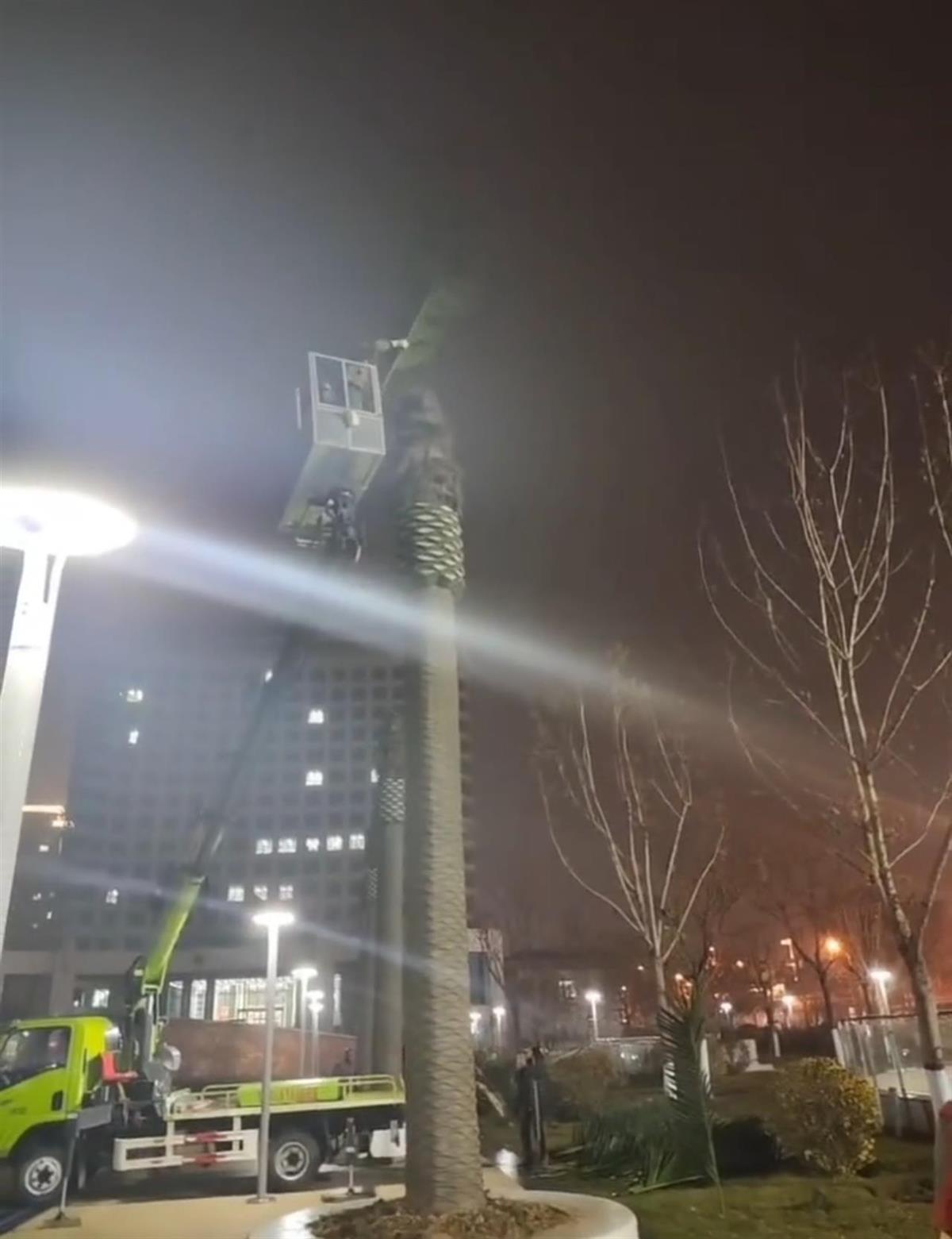 12日晚,有网友发视频称,清徐县人民广场的仿真椰子树已连夜开始拆除。13日,有媒体报道提到,广场上有几辆吊车在施工,工人在拆除仿真椰子树上的装饰品,工作人员提醒行人禁止通过。