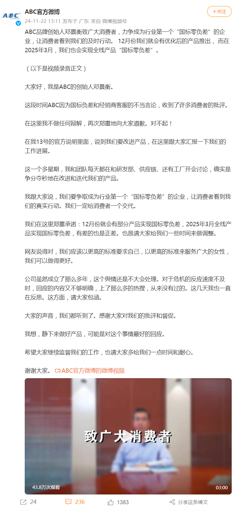 11月22日,ABC品牌创始人邓景衡通过品牌官方微博发布视频致歉,回应近期ABC因国标负差和经销商客服的不当言论产生的相关争议,“在这里我不做任何辩解,再次郑重地向大家道歉。对不起!”。邓景衡称,公司要争取成为行业第一个“国标零负差”的企业,12月份就会有部分产品实现国标零负差,2025年3月全线产品实现国标零负差。