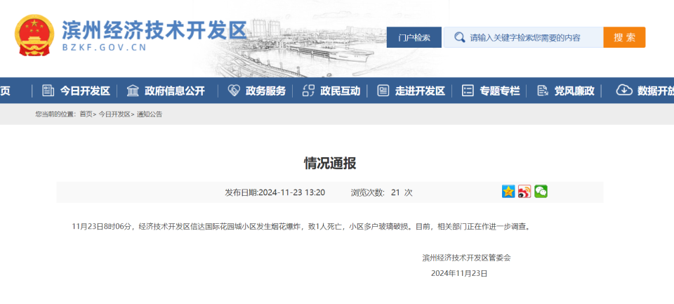 11月23日13:20,山东省滨州经济技术开发区管委会发布情况通报:11月23日8时06分,经济技术开发区信达国际花园城小区发生烟花爆炸,致1人死亡,小区多户玻璃破损。目前,相关部门正在作进一步调查。