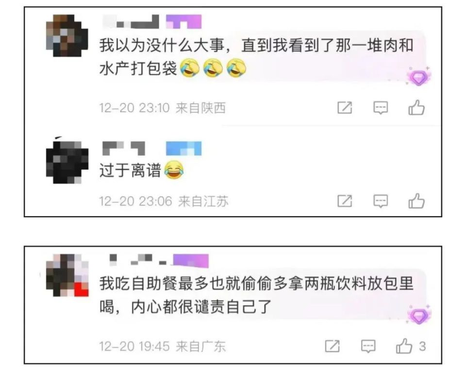 还有网友表示:自助餐偷偷带点饮料水果也没多大事,但看到那一堆肉和水产打包袋,还是被深深震撼了。