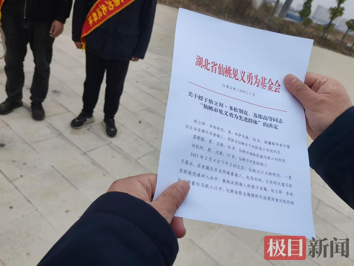 2月4日,湖北省仙桃市汉江边,一名男子不慎落水,危急关头,一男子骑着一匹白马冲入水中救人,上演了一场生死救援。这几天,极目新闻率先报道的骑马救人事件在全网刷屏。不少网友呼吁,除三位救人英雄外,还应该给“白龙马”授予见义勇为的称号。2月6日上午,极目新闻从仙桃政法委了解到,仙桃见义勇为基金会决定授予依立拜、刘杭州、苏邵高“仙桃市见义勇为先进群体”称号。