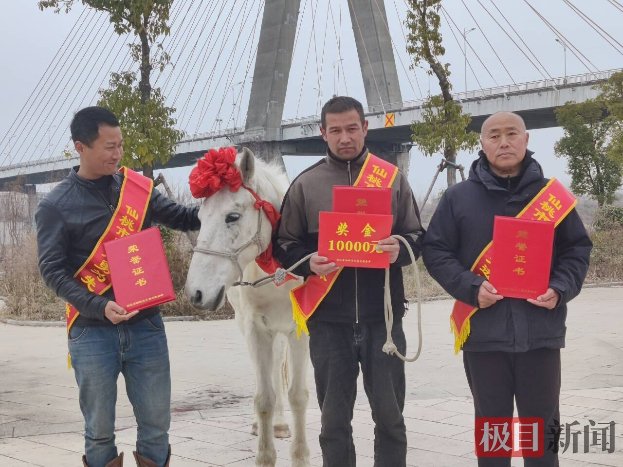 当天上午,仙桃政法委等部门人员上门慰问救人三人组外,并“听劝”回应网友的呼吁,专程给“白龙马”开了一个现场“表彰大会”,给它头戴红花、准备了新鲜的玉米等草料,以嘉奖其见义勇为。