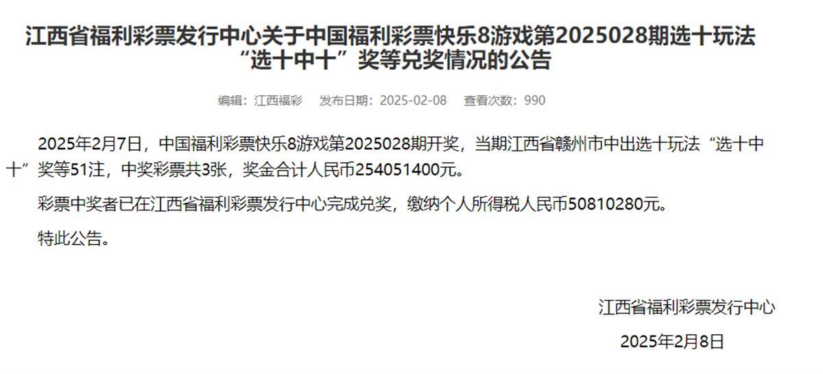 2月8日,江西省福利彩票发行中心发布公告称,2025年2月7日,中国福利彩票快乐8游戏第2025028期开奖,当期江西省赣州市中出选十玩法“选十中十”奖等51注,中奖彩票共3张,奖金合计人民币254051400元。彩票中奖者已在江西省福利彩票发行中心完成兑奖,缴纳个人所得税人民币50810280元。