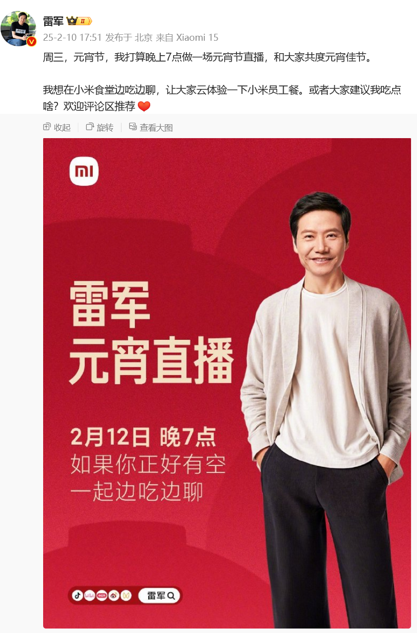 2月10日,雷军宣布将于元宵节当晚7点直播,和大家共度佳节。