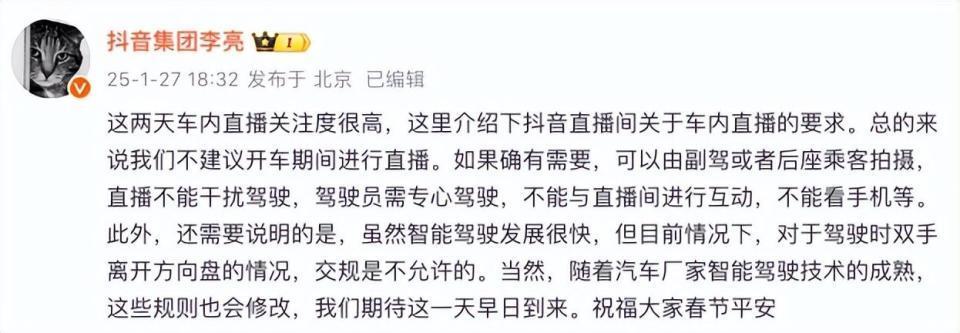 1月27日,抖音集团副总裁李亮发文称,不建议开车期间进行直播。