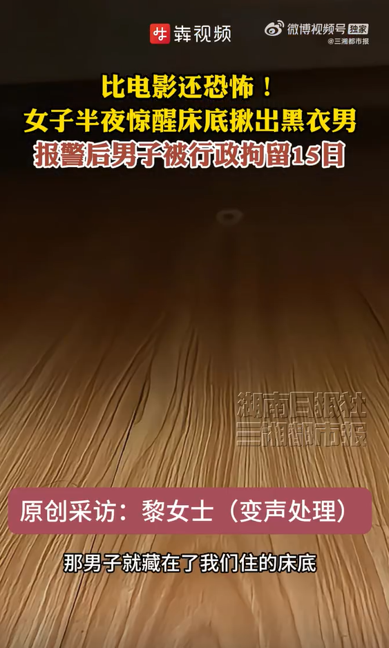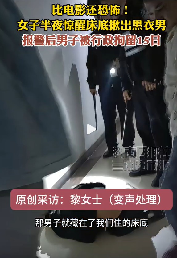 2月11日,湖南长沙,家住浏阳市东润·万象城的黎女士向记者爆料:今年1月27日半夜,突然听到床底有动静,随即叫醒熟睡的老公查看,结果发现一名黑衣男子,人当场都吓傻了。