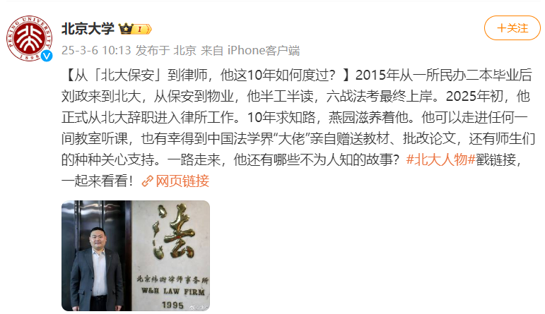 3月6日,据北京大学,2025年初,保安刘政从北大辞职,进入律所工作。2015年,刘政从一所民办二本毕业后他来到北大,从保安到物业,他半工半读,六战法考最终上岸。刘政说:“这些年在北大,我看过的书真不少。可以问心无愧地说,最好的年华,我没有虚度。”