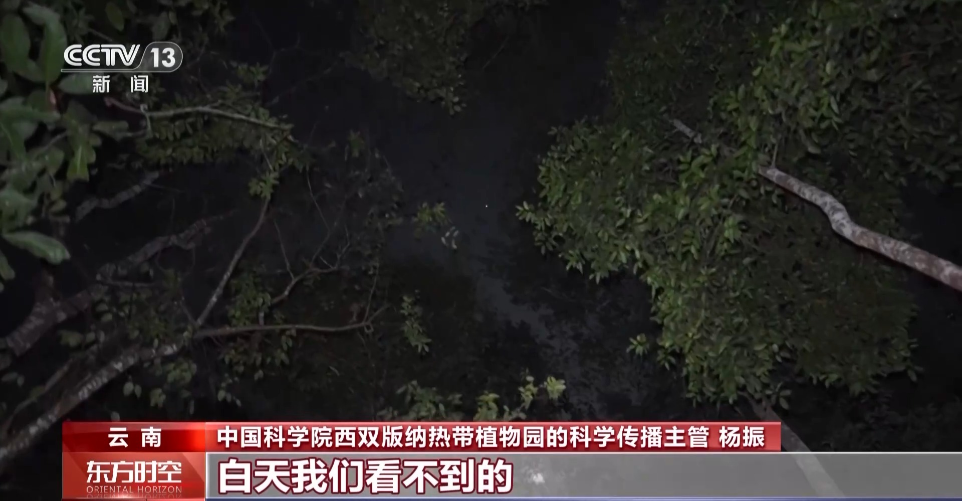 中国科学院西双版纳热带植物园的科学传播主管 杨振:其实有很多的生物,它活跃的时间在晚上。白天我们看不到的,所以我们有夜游这一个体验。有很多的昆虫,为了避开鸟类的捕食选择在晚上活动,然后它进化出了很多在夜晚活动的能力。