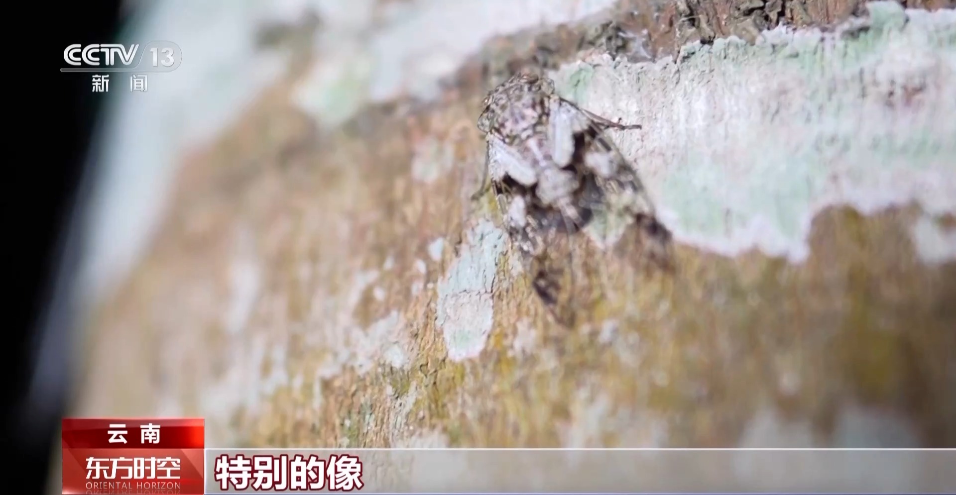 中国科学院西双版纳热带植物园的科学传播主管 杨振:这个更精彩,蟪蛄它身上的花纹跟这个树上生长的地衣特别像,它在趴在那里像隐身了一样。