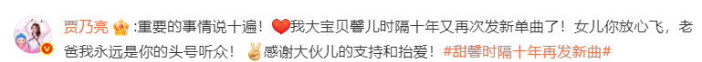 “重要的事情说十遍!我大宝贝馨儿时隔十年又再次发新单曲了!女儿你放心飞,老爸我永远是你的头号听众!感谢大伙儿的支持和抬爱!#甜馨时隔十年再发新曲# ”
