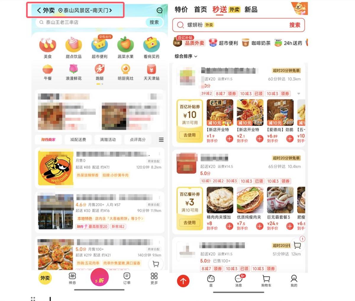 2日,极目新闻记者在美团外卖、京东外卖平台上,将配送地址选定为临近泰山山顶的南天门,平台上显示有多家餐厅,配送时长为一到两小时不等。