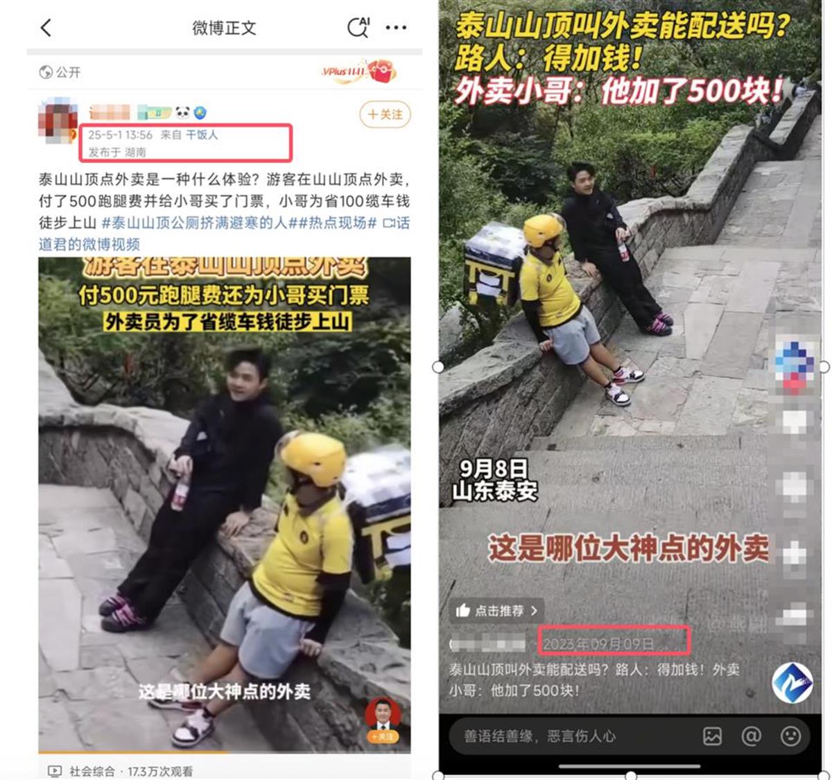 左图为今年5月1日有博主发布的视频,右图为2023年短视频平台上同一视频