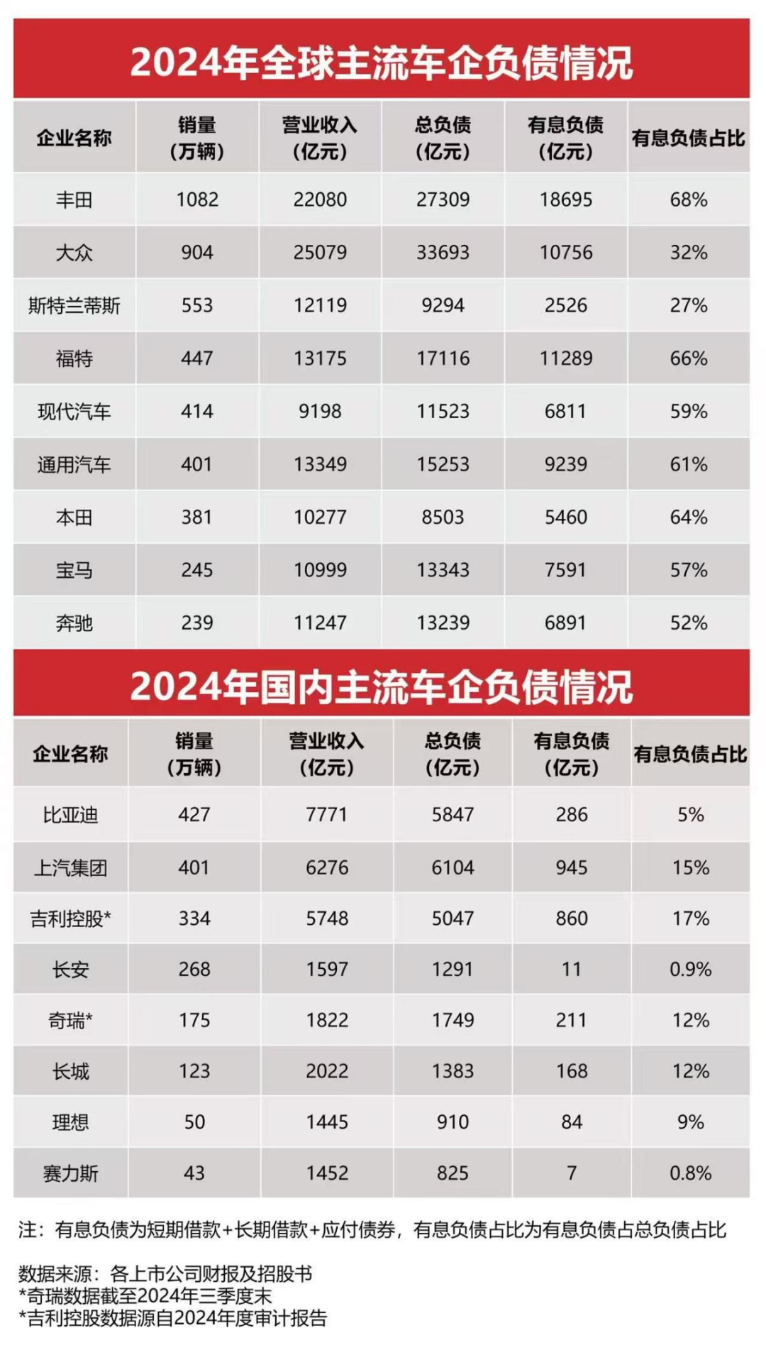 相比之下,全球销量领先的丰田、通用、福特等巨头,2024年其有息负债占比均在60%以上。中国主流本土车企的这一比例则显著偏低:吉利约为17%,长城为12%,比亚迪低至5%,长安和赛力斯甚至不到1%。