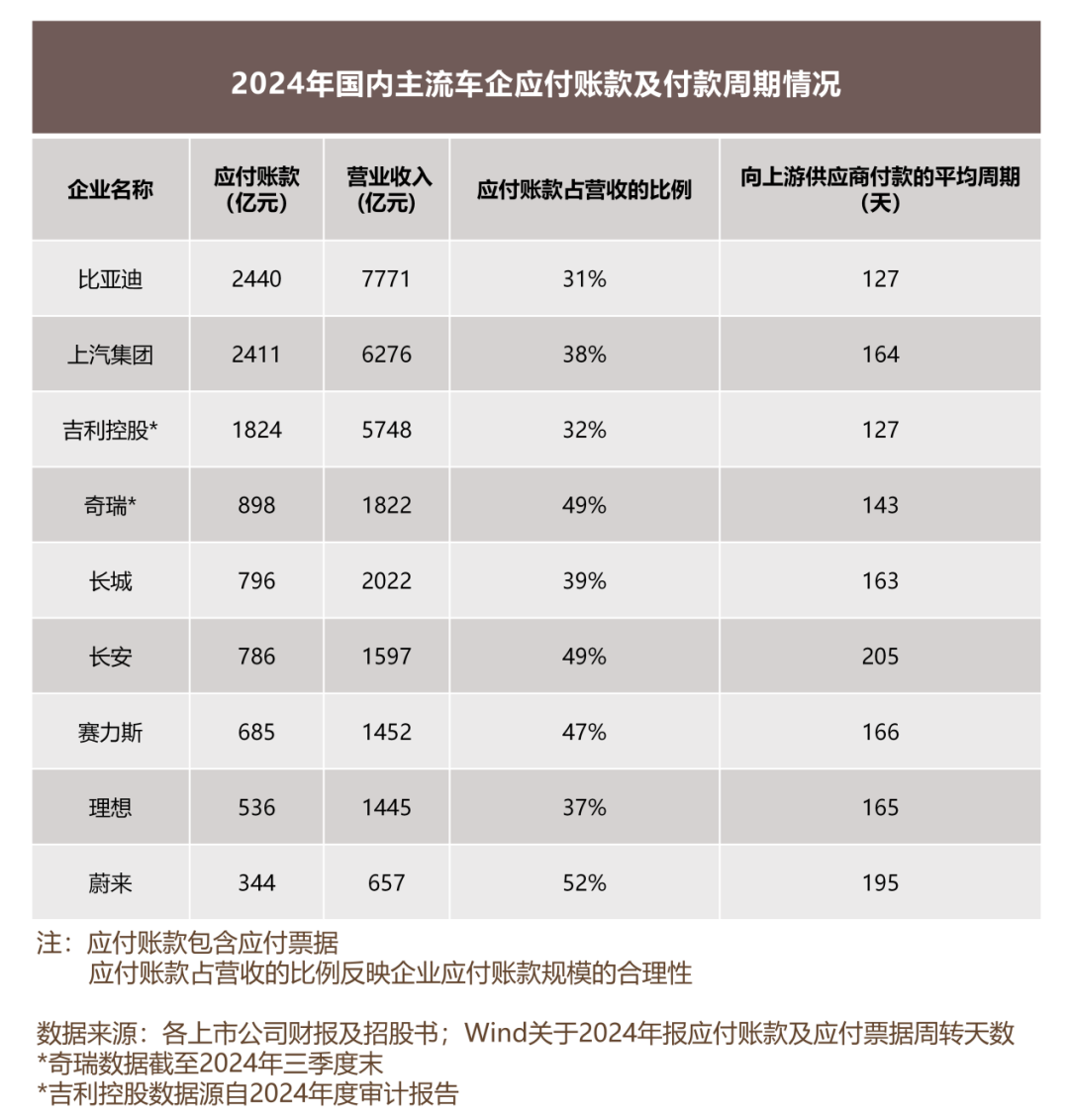 影响供应商资金流动的应付账款及账期方面。Wind数据显示,2024年应付账款占营收比例上,蔚来52%,奇瑞49%(截至2024年三季度末),吉利32%,比亚迪31%。在向上游付款的平均周期上,吉利与比亚迪均为127天,处于业内相对较短的区间。