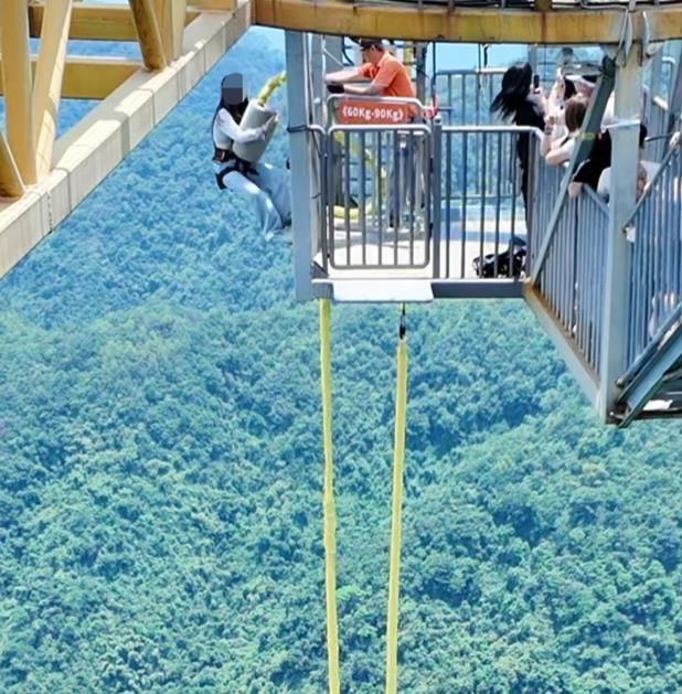 视频显示,女子跳下去的瞬间,工作人员有助推动作,视频中没有下坠后的详细画面。