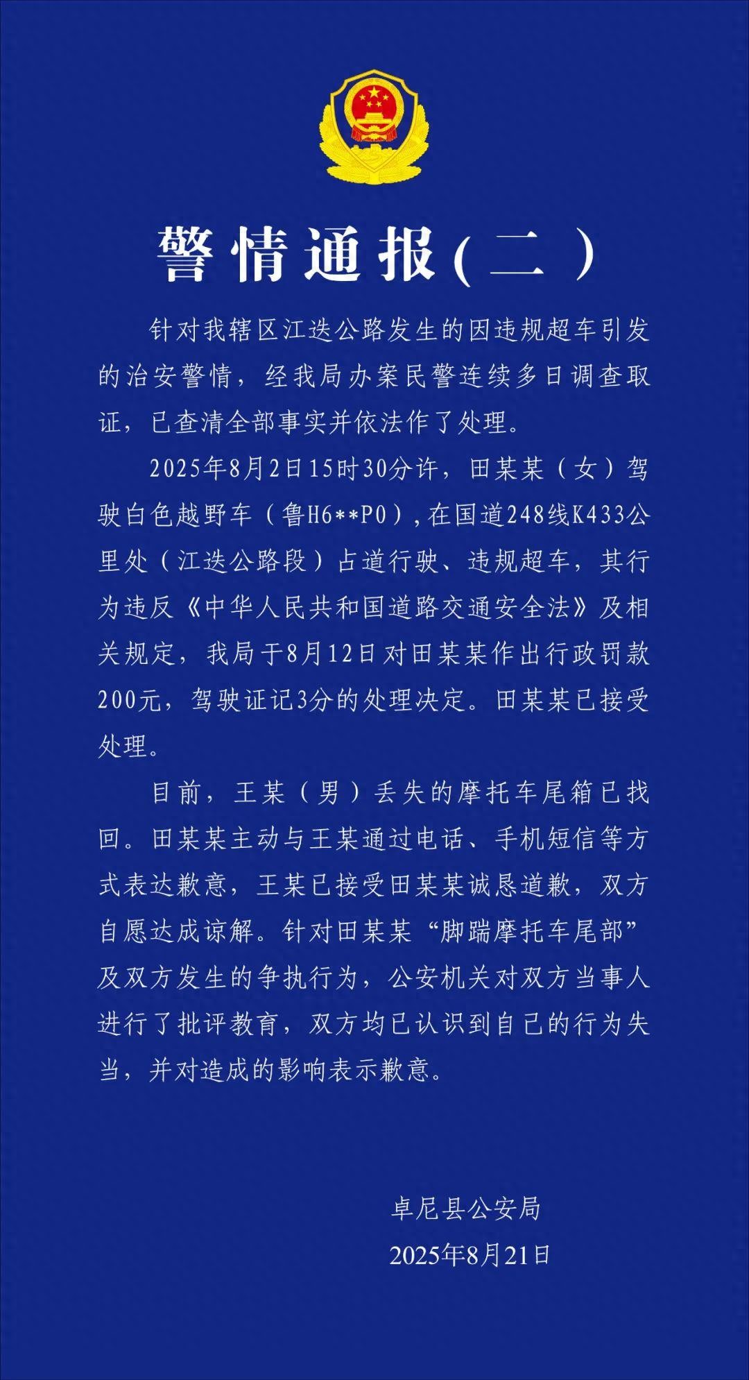 2025年8月2日15时30分许,田某某(女)驾驶白色越野车(鲁H6**P0),在国道248线K433公里处(江迭公路段)占道行驶、违规超车,其行为违反《中华人民共和国交通安全法》及相关规定,我局于某作出行政罚款200元,驾驶证记3分的处理决定。田某某已接受处理。