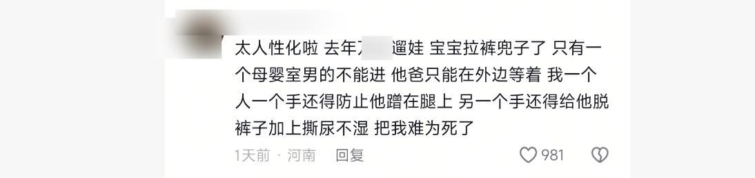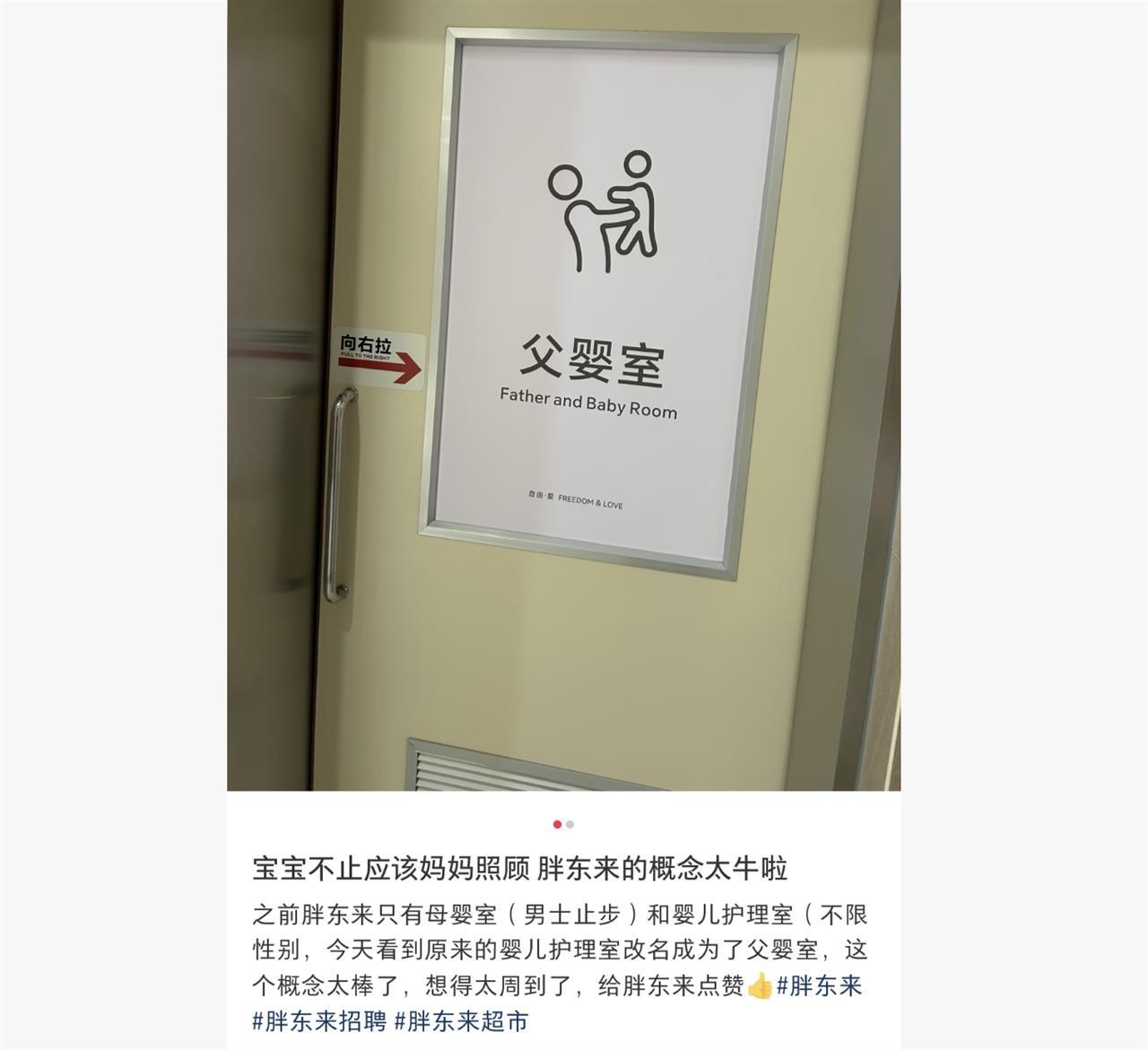 近日,有消费者在河南省新乡市胖东来(大胖)店看到,商场内竟贴心地设置了父婴室,她直呼“太超前”,众多网友也为此举点赞。有宝妈结合自身经历称,有的商场母婴室不让男士进,女性独自照顾宝宝,有时候忙不过来,胖东来设置的父婴室很人性化。