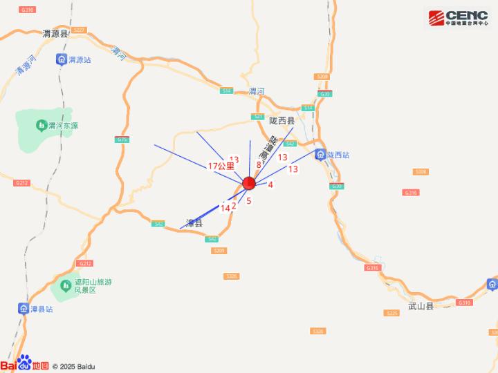 周边县城:震中距漳县12公里、距陇西县12公里、距武山县35公里、距渭源县42公里、距通渭县69公里,距定西市78公里,距兰州市145公里。