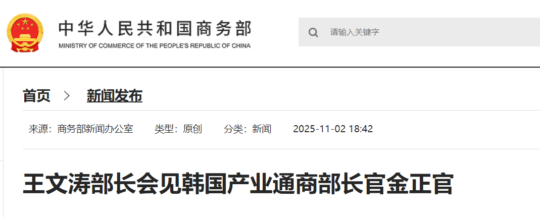 11月2日,据商务部网站消息,11月1日,商务部部长王文涛在韩国庆州会见韩国产业通商部长官金正官。双方就维护产业链供应链稳定、加强区域及多双边合作等交换意见。