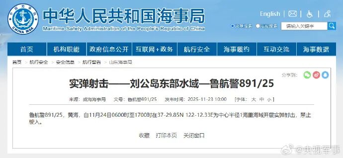 据中国海事局网站消息,威海海事局发布航行警告:鲁航警891/25,黄海,自11月24日06:00时至17:00时在37-29.85N 122-12.33E为中心半径1海里海域开展实弹射击,禁止驶入。