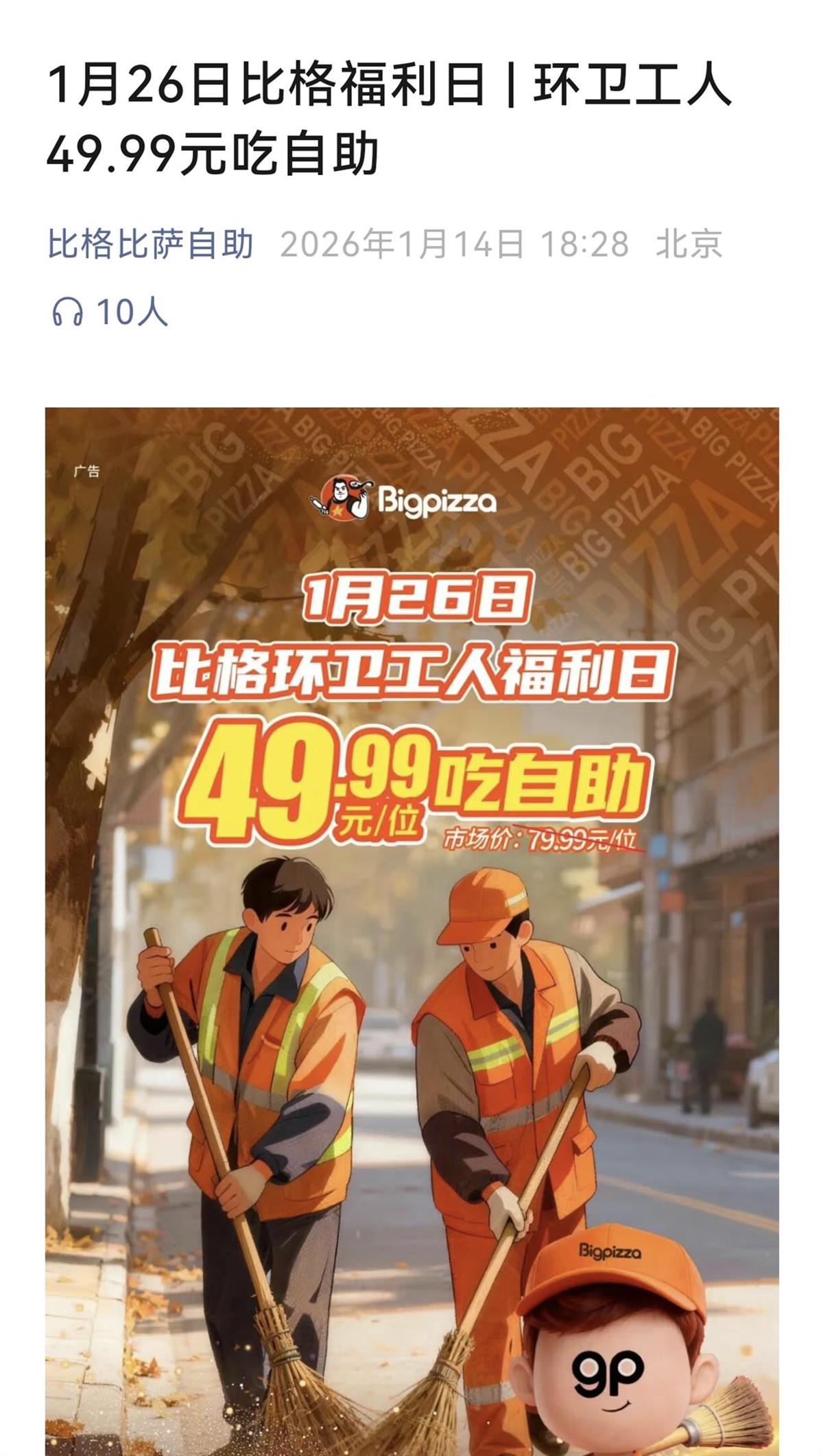 近日,比格比萨推出“环卫工人49.99元吃自助”福利日活动,引发热议。活动规则显示,1月26日当天,环卫工人持本人环卫工作证或身着工作服等,核验身份后到店享受自助全国统一特惠价49.99元/位,原市场价为79.99元/位。