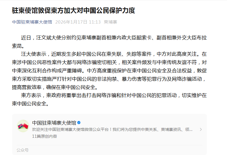 1月17日,中国驻柬埔寨大使馆发文《驻柬使馆敦促柬方加大对中国公民保护力度》: