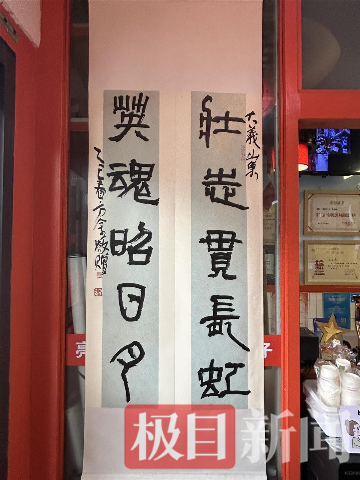 在生意火爆的同时,火锅店也悄然发生着变化。大门口多了一块刻着“栾留伟英雄店”几个大字的牌匾,店里的墙上还多了栾留伟的画像,两侧悬挂着“齐鲁好男儿”“人民英雄”“舍己救人”等十多幅锦旗和书画作品。