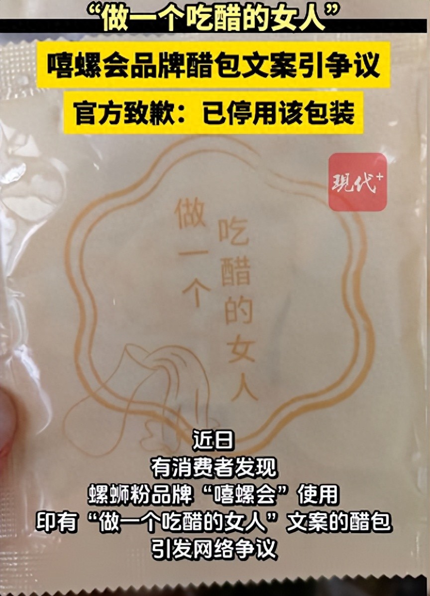 近日,有消费者发现,螺蛳粉品牌“嘻螺会”使用印有“做一个吃醋的女人”文案的醋包,引发网络争议。有网友表示,向该品牌网店客服反馈后,客服表示“暂时不改包装”。